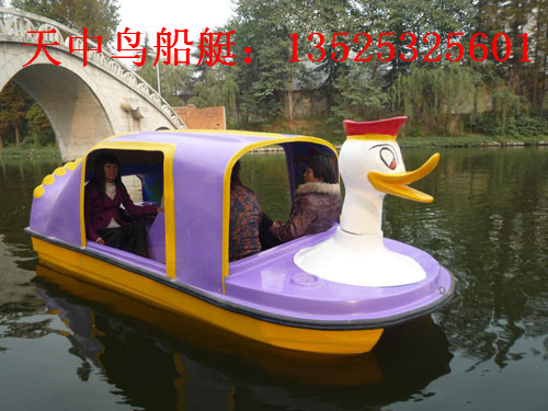 编号:TZN370 名称:TZN370型卡通脚踏船 乘员:4人 尺寸:3.7*1.45*0.6 航速:8公里 配机:脚踏