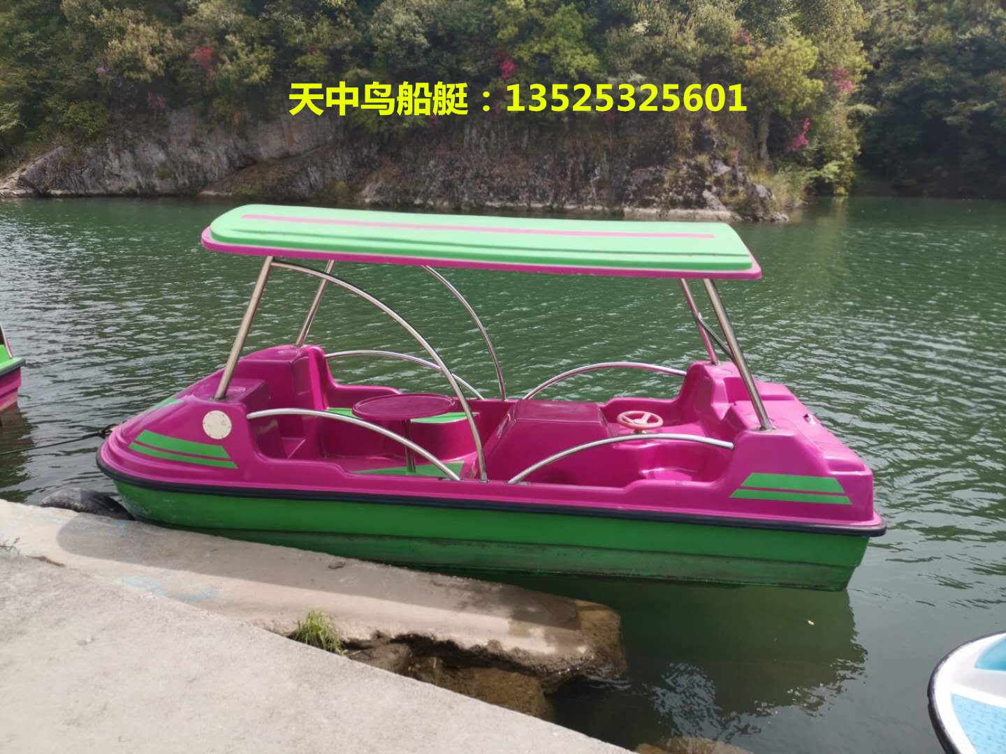 编号:TZN410 名称:6人脚踏船 乘员:6人 尺寸:4.1*1.45*0.8 航速:不追求速度 配机:脚踏