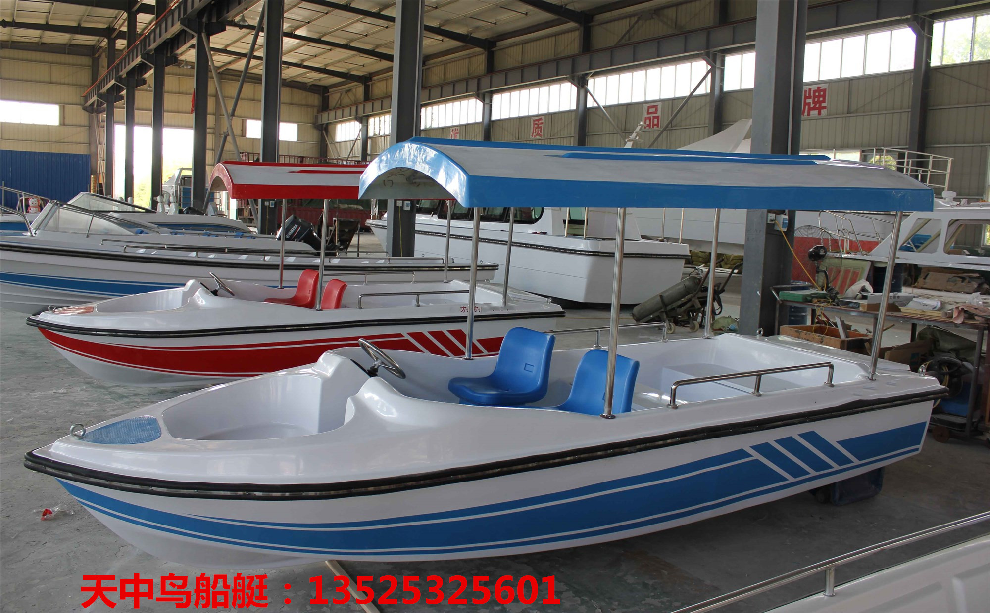 名称:TZN410电动船 规格:4.1*1.4*0.62 乘员:6人 配机:650W电机 航速:8-10公里