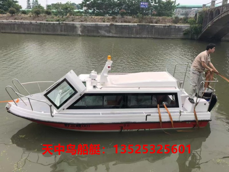 名称:TZN605全棚高速艇 规格:6.05M*1.96M*0.96M 乘员:9+1人 配机:40HP-150HP汽油外挂机 航速:30-65km/h