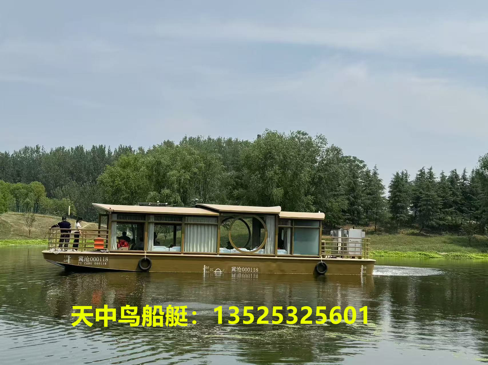 名称:TZN1550铝合金新中式画舫艇 规格:15.5*4.3*1.2 乘员:44人 配机:2台7.5KW电机 航速:10公里